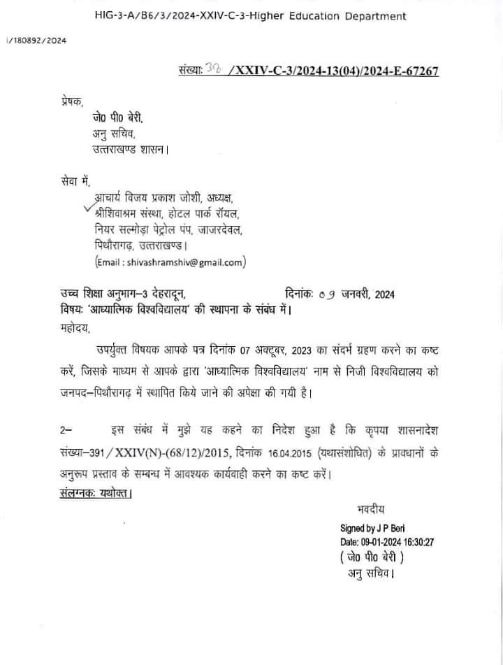 This center is an international group of truth-seeking seekers, researchers and scientists. Truth-seeking is its main objective. Its method of thinking is to inspire the development of self-consciousness by synthesising science, religion and philosophy. The aim of the institute is to work for social spiritual development and progress and welfare of man. Shivashram was established on Kartik Shukla Purnima Samvat 2075 in 2018. Adhyatmik Paddhati Foundation (NGO) was registered on 8 April 2023. This institute is located at Dharchula Road, Jajar Deval, District Pithoragarh in Devbhoomi Uttarakhand. This institute is a great source of inspiration for truth-seeking seekers, readers, students studying spirituality-yoga, teachers and trainers and is the only institute for guidance in truth-seeking. We hope that all of you, seekers, devotees will cooperate with us to the best of your abilities for self-welfare and public welfare and by taking admission in the courses prescribed by the Spiritual University.